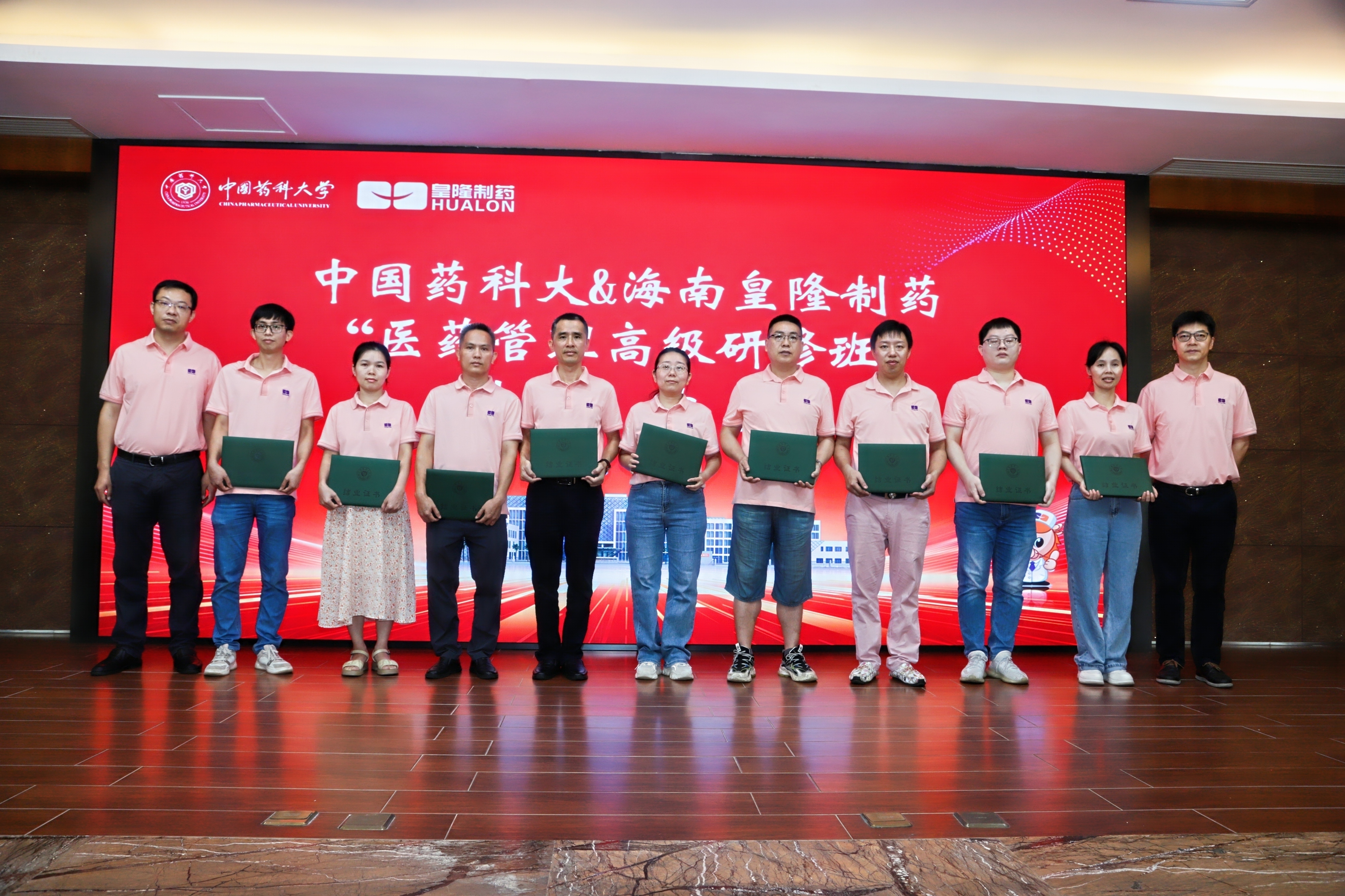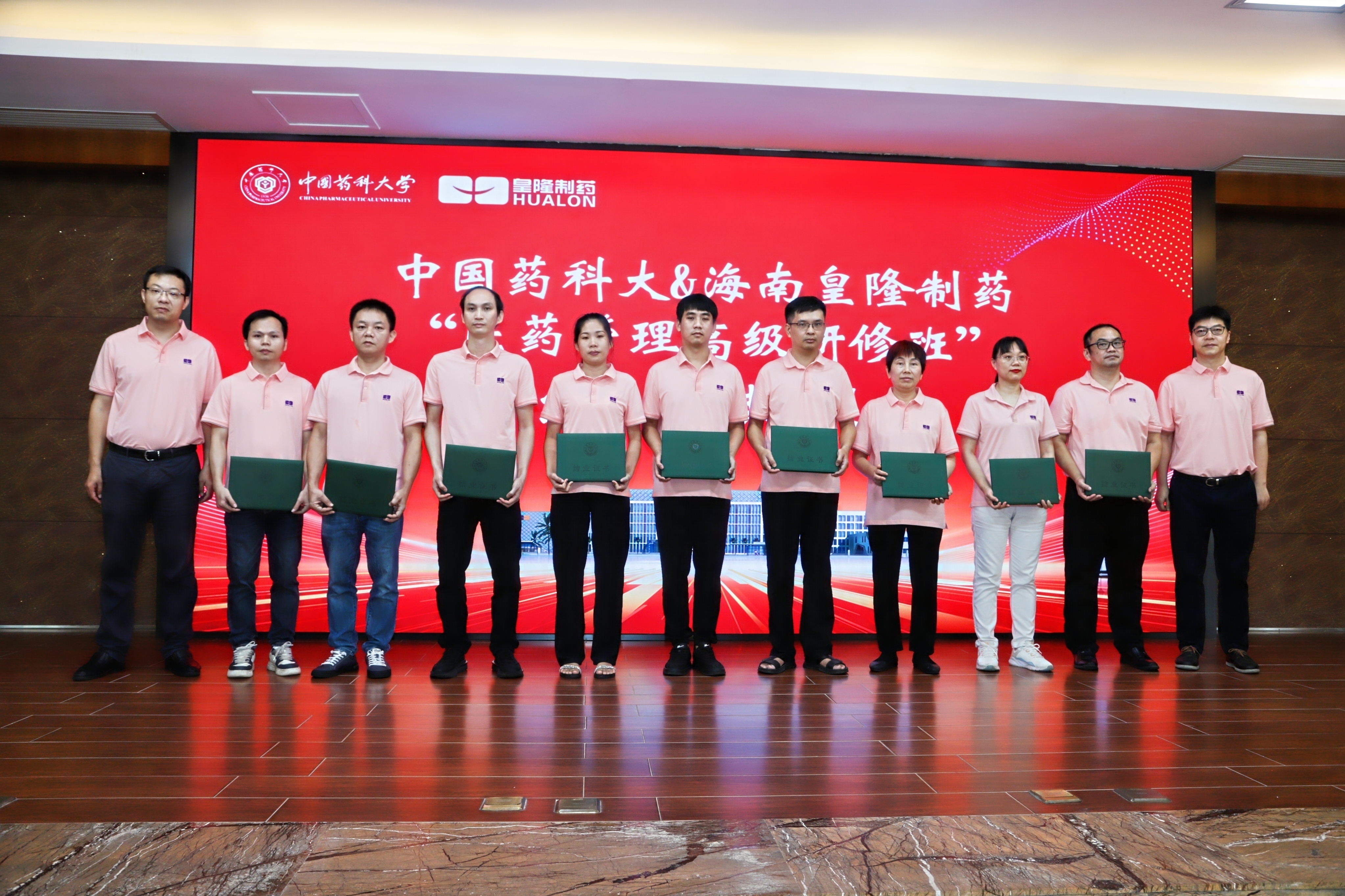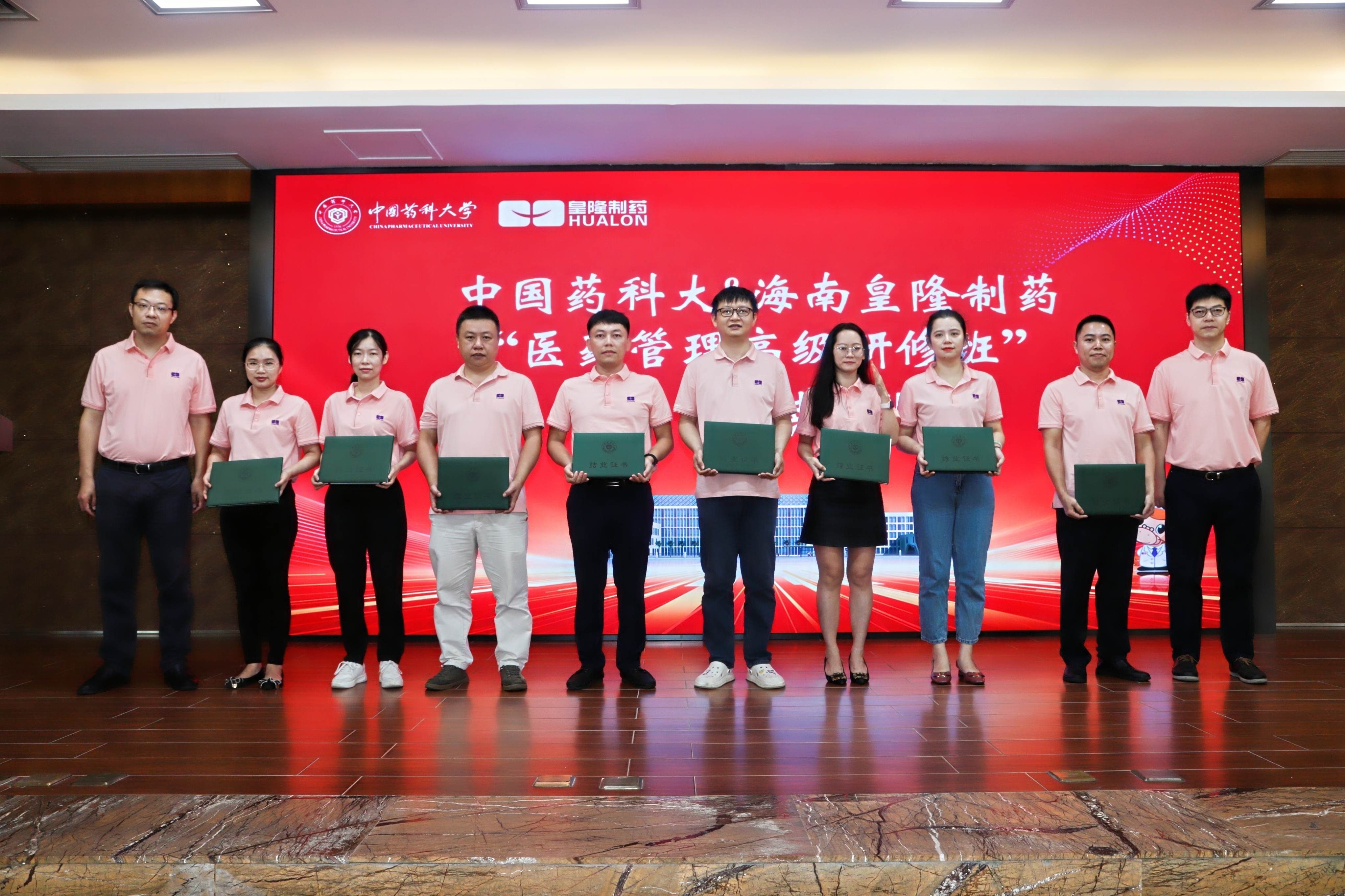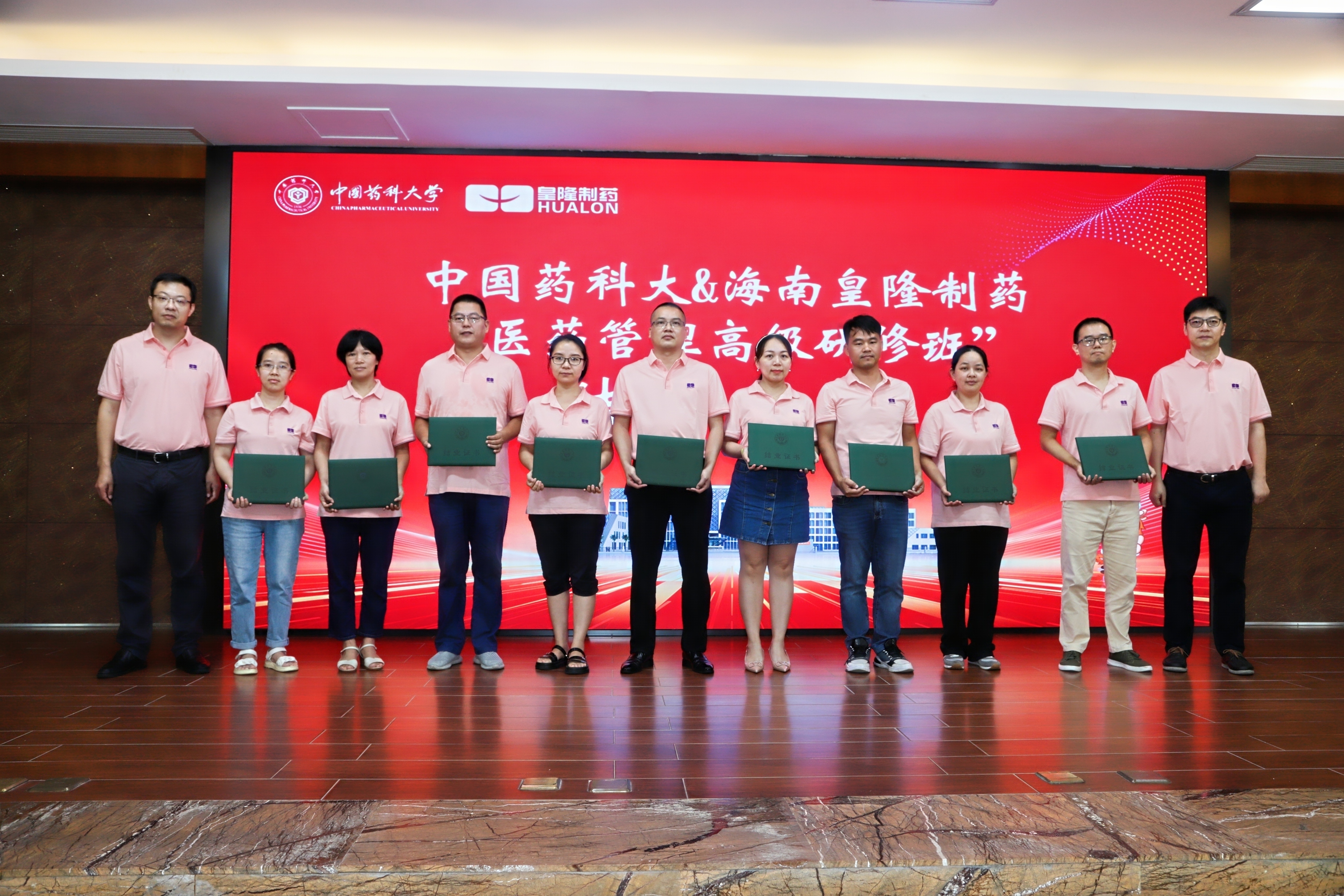 7月23日上午,中國藥科大學(xué)“專業(yè)學(xué)位研究生院級(jí)實(shí)踐基地”揭牌儀式暨中國藥科大學(xué)&海南皇隆制藥“醫(yī)藥管理高級(jí)研修班”結(jié)業(yè)典禮在海南皇隆制藥股份有限公司成功舉行。海口國家高新技術(shù)產(chǎn)業(yè)開發(fā)區(qū)工委副書記、管委會(huì)主任李杉、中國藥科大學(xué)研究生院副院長李飛、中國藥科大學(xué)國際醫(yī)藥商學(xué)會(huì)副院長徐偉、海南皇隆制藥股份有限公司董事長陳益智、公司管理層以及54名學(xué)員共同參加了本次儀式。